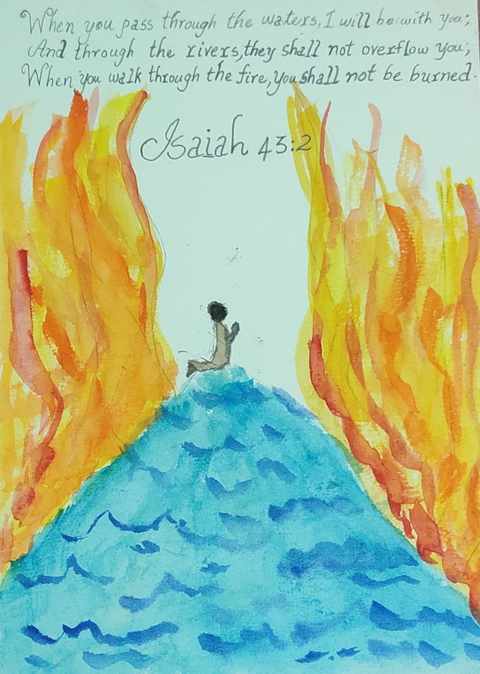 Isaiah 43:2 When you pass through the waters, I will be with you; and through the rivers, they shall not overwhelm you; when you walk through fire you shall not be burned, and the flame shall not consume you.